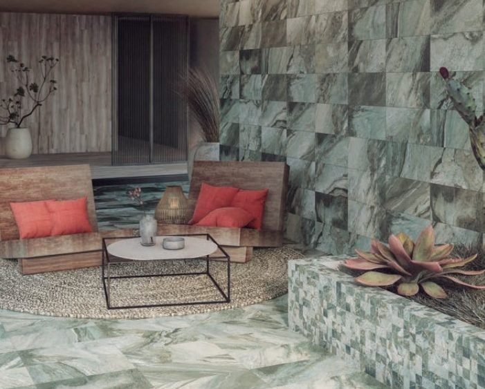 El tono verde, inspirado en la piedra natural, crea ambientes frescos y elegantes, perfectos para terrazas, jardines y piscinas. Fabricado en porcelánico de primera calidad, ofrece resistencia al agua, al desgaste y a los cambios de temperatura.